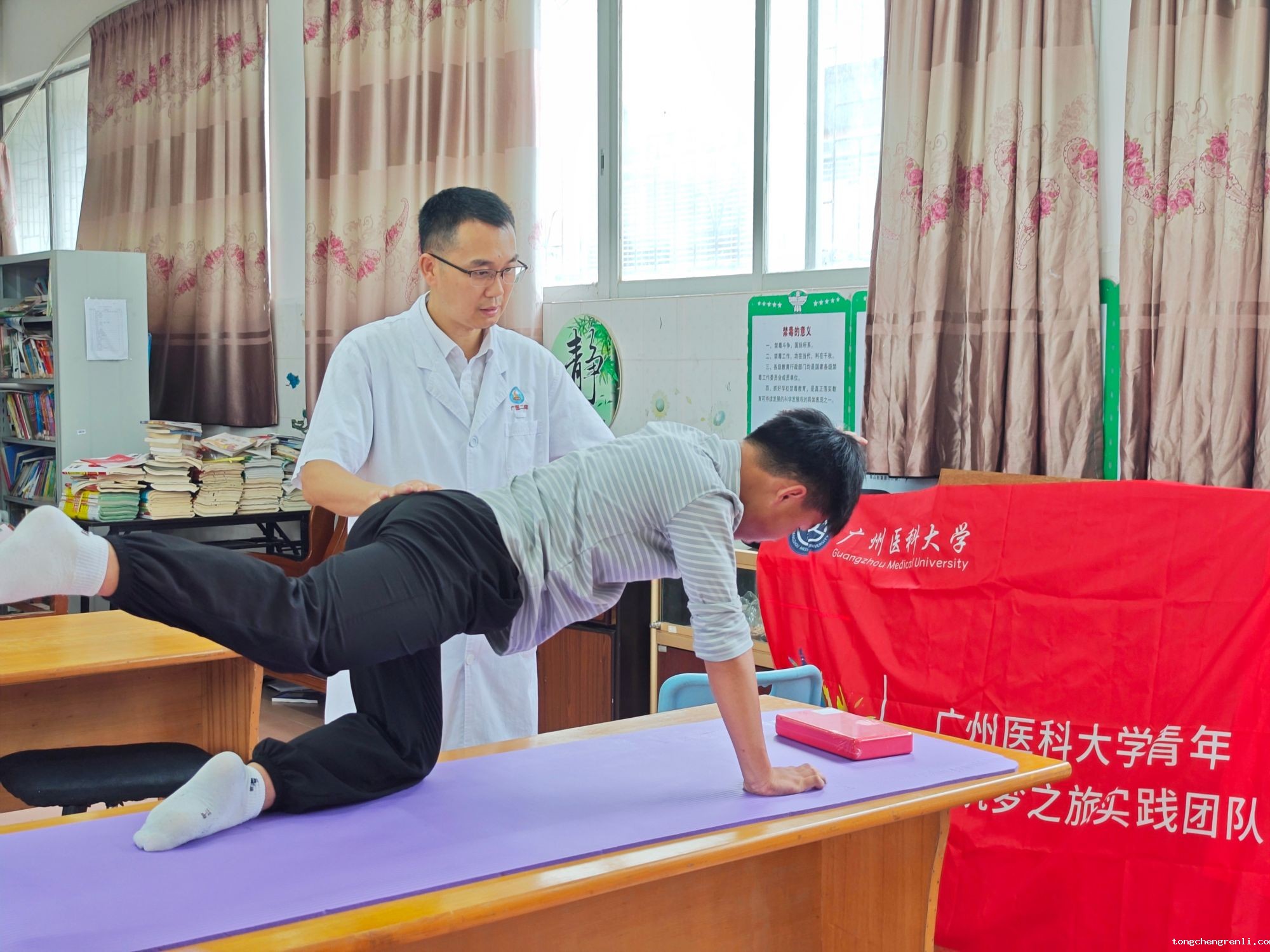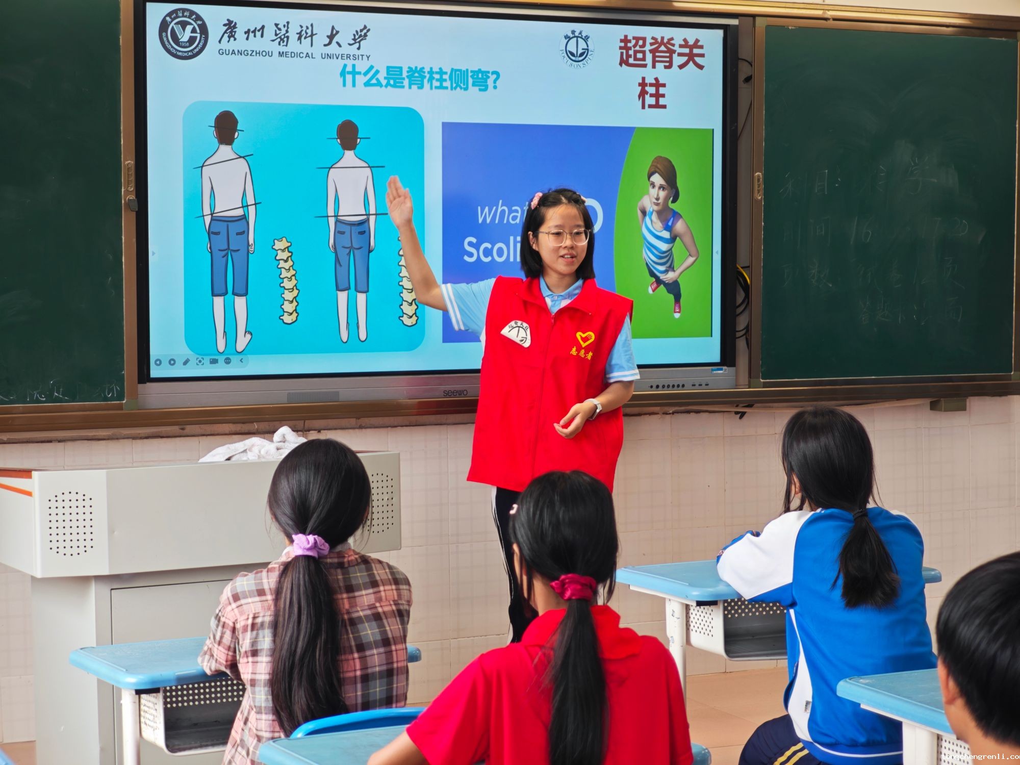 为呵护连山壮族瑶族自治县中小学学生脊柱健康,根据“双百行动”工作部署,5月21日至22日,我校第二临床学院联合华南理工大学体育学院到连山永丰中心学校开展志愿服务活动,第二临床学院谭永振老师带领志愿者团队开展脊柱侧弯筛查、脊柱侧弯小讲堂、健康姿势矫正、物资捐赠等系列活动。