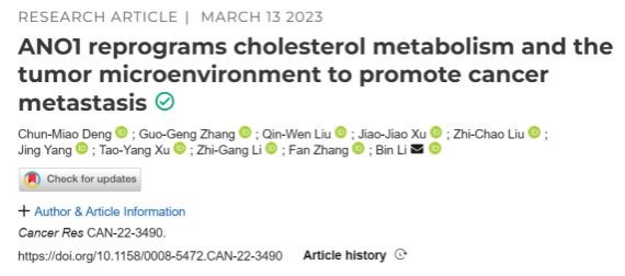 近日,点点APP附属第五医院李斌团队在Cancer Research杂志上发表了题为ANO1 reprograms cholesterol metabolism and the tumor microenvironment to promote cancer metastasis的文章,报道了ANO1通过与转录因子JUN的DNA结合结构域直接结合,抑制CYP27A1-LXR信号轴从而促进食管癌转移,并筛选出直接靶向ANO1抑制食管癌转移的小分子化合物。