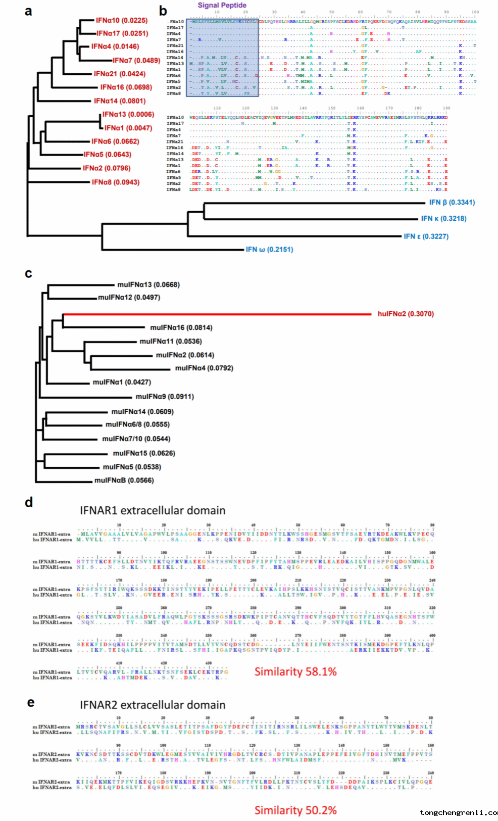 图1 I型干扰素序列比对以及人和小鼠I型干扰素受体胞外结构域氨基酸序列比对
