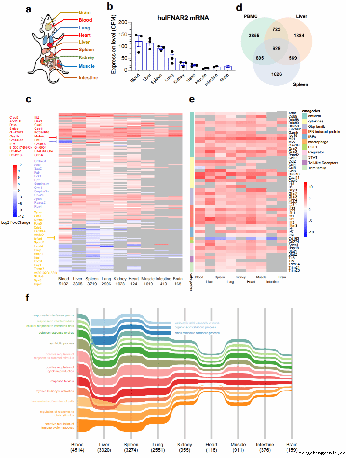 随后,该团队研究了脑、血、肺、心、肝、脾、肾、肌肉、肠9个主要组织对人干扰素刺激的体内应答图谱。首次揭示了健康个体对人干扰素应答的组织和器官特异性,其中,血液和肝脏免疫应答最明显,而肠道和脑免疫应答最弱(图3)。该研究所描绘的器官和组织特异性干扰素应答图谱尚未在健康人体中报道。
